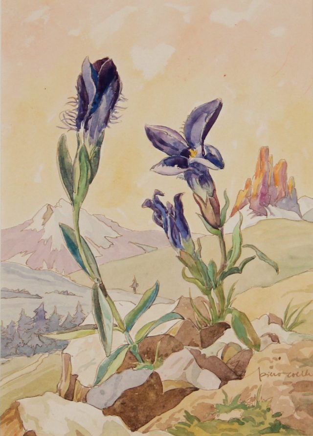 Era il 1952 quando la Sat pubblicava un piccolo e raffinato libro sui fiori di montagna con 64 opere di Piero Coelli (Pirano d’Istria, 1893; Rovereto, 1980) corredate dalle relative schede. La meraviglia dei fiori alpini, la loro importanza per la biodiversità dell’ambiente alpino e la loro forza simbolica immortalata sulle cartoline del tempo e nei canti delle gite sociali -chi non ricorda “Quel mazzolino di fiori / che vien dalla montagna”?- sono gli elementi alla base del percorso espositivo, possibile grazie al prestito delle opere da parte del nipote del pittore, Carlo Coelli.