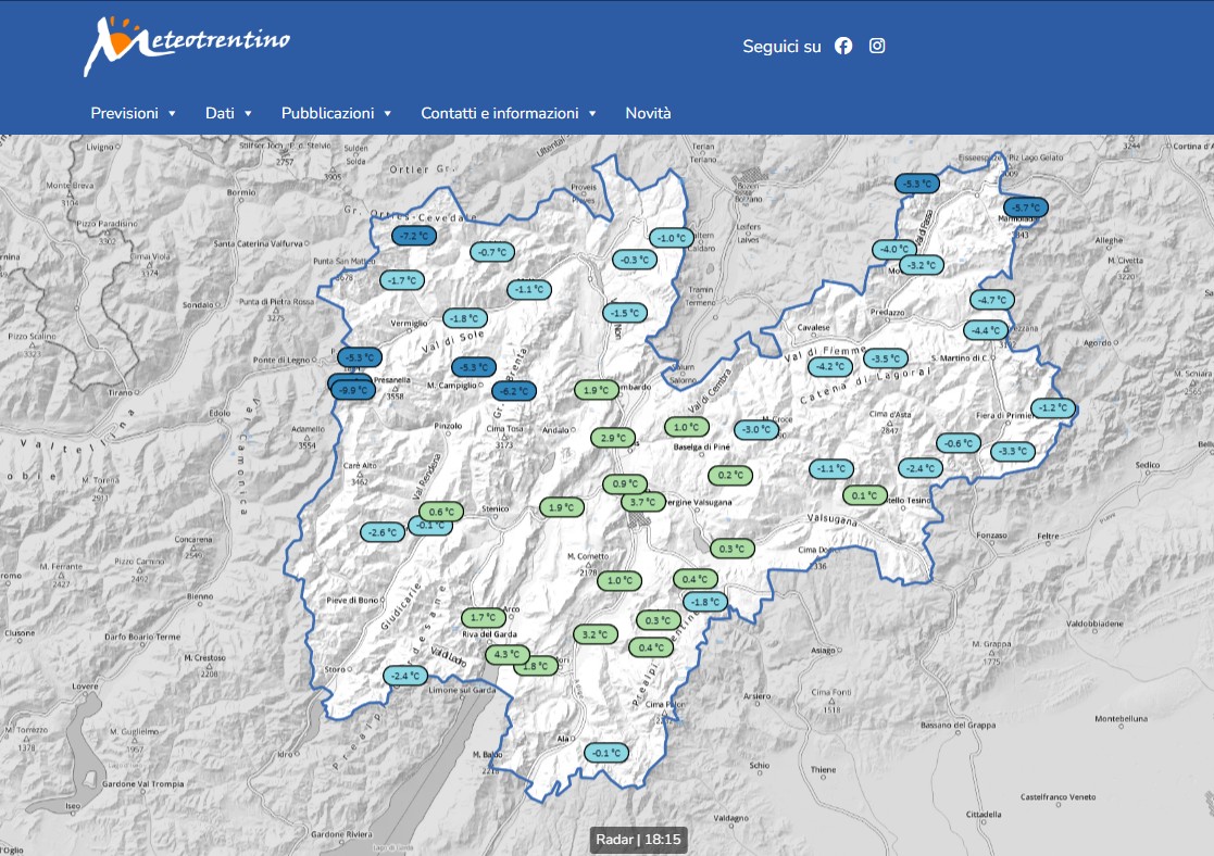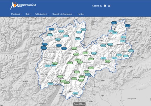 La nuova homepage di Meteotrentino si apre sulla mappa interattiva che mostra in tempo reale le principali variabili meteorologiche sul territorio. I dati, raccolti attraverso il radar installato sul monte Macaion e integrati con le stazioni meteo territoriali, vengono trasmessi direttamente sulla mappa, dove l’utente può scegliere di visualizzare e approfondire le informazioni relative a temperatura, vento e precipitazioni.