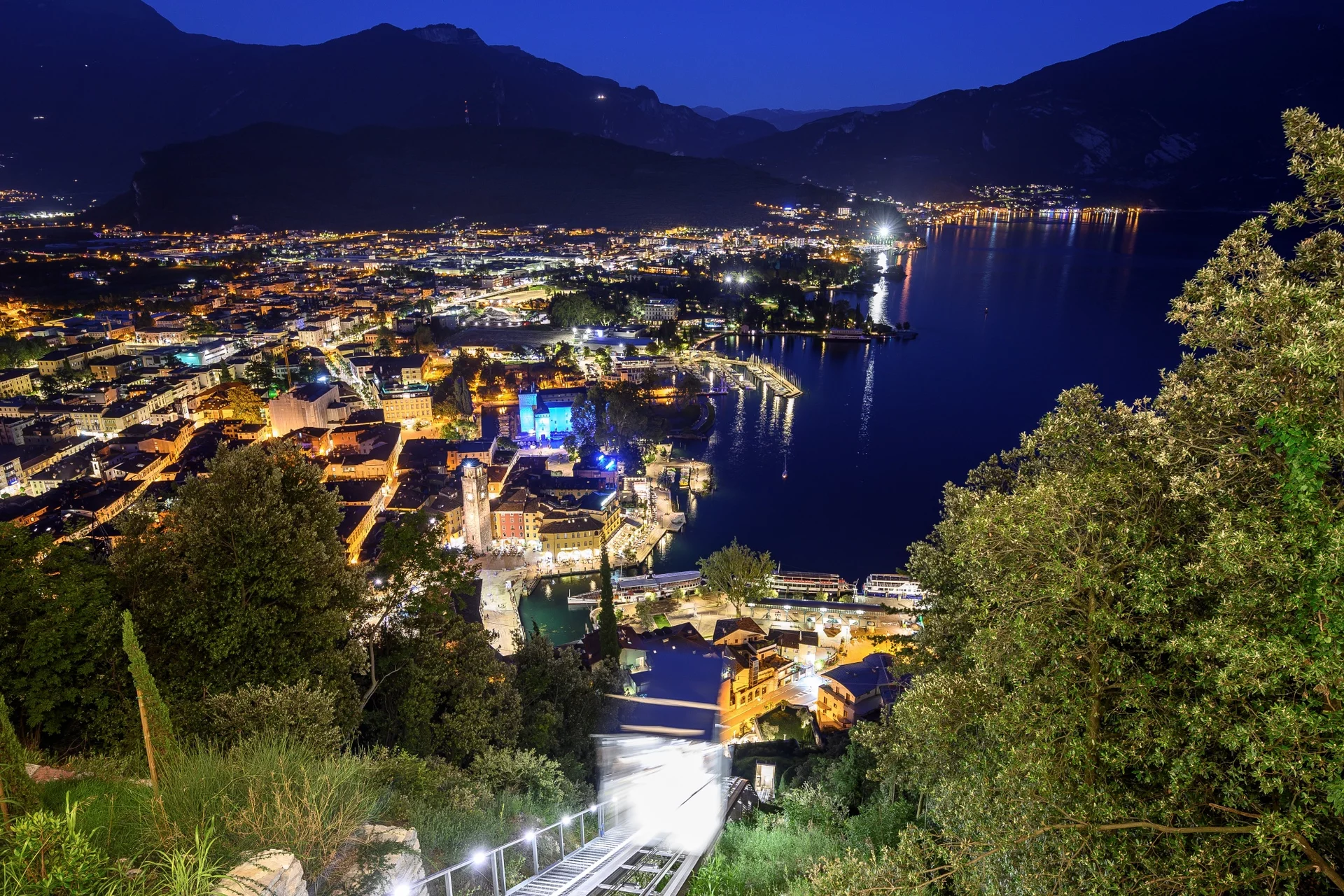 L’impianto, diventato negli ultimi anni una delle esperienze più apprezzate dai visitatori, consente di raggiungere il Bastione in circa tre minuti attraverso un percorso inclinato di 208 metri, superando un dislivello di 130 metri. La cabina, interamente realizzata in vetro e cristallo, offre durante la salita una vista progressivamente sempre più ampia sul centro storico di Riva del Garda e sull’ampio scenario del lago.