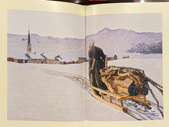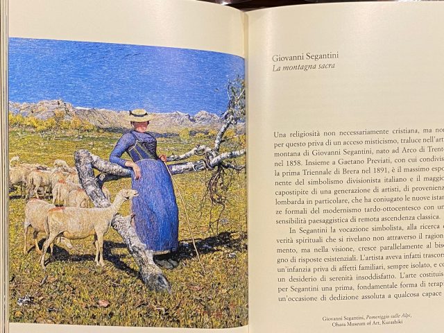 Il capitolo dedicato a Giovanni Segantini, pittore di origini arcensi, occupa una posizione di rilievo nel libro. Intitolato La montagna sacra (pagine 179–195), è introdotto già nel risguardo di apertura da una delle sue opere più note, Ritorno dal bosco, oggi esposta al Museo Segantini di St. Moritz. Una scelta non casuale, che segnala fin dall’inizio il ruolo centrale attribuito dall’autore al pittore.