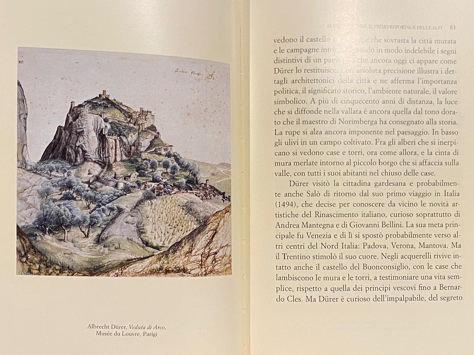 Arco ritorna protagonista anche nel capitolo dedicato ad Albrecht Dürer, significativamente intitolato Il primo reportage delle Alpi. Qui Sgarbi racconta il viaggio italiano del maestro tedesco alla fine del Quattrocento, soffermandosi sugli acquerelli di paesaggio che segnano una svolta nel modo di osservare la natura. Tra questi, trovano spazio le immagini della Veduta di Arco: sia il celebre foglio conservato al Musée du Louvre di Parigi, sia un particolare della stessa opera.
